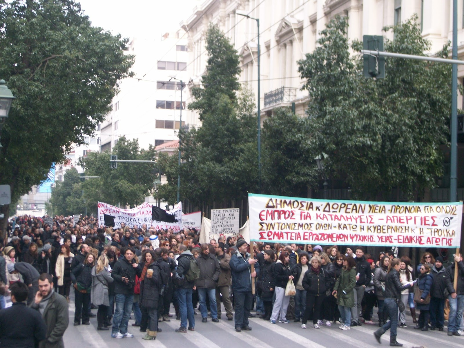 Οι εργαζόμενοι στην Ψυχική Υγεία και την Ειδική Αγωγή, ύστερα από 15 μέρες κατάληψης στο υπουργείο Υγείας, κορυφώσαμε τις κινητοποιήσεις μας με την 48ωρη απεργία Τετάρτη - Πέμπτη 22 – 23 Φεβρουαρίου. Στη 48ωρη απεργία καλούσαν και στήριζαν τα κλαδικά σωματεία ψυχικής υγείας ΣΕΨΑΕΚΟ και Εργαζομένων Ψυχαργώς Αττικής καθώς και το κλαδικό σωματείο ειδικής αγωγής ΣΕΜΙΣΕΑ, τα σωματεία εργαζομένων στο Περιβολάκι και την ΠΕΨΑΕΕ, η Πανελλήνια Ομοσπονδία Εργαζομένων στην Ειδική Αγωγή (ΠΟΜΕΕΑ), ο Σύλλογος Εργαζομένων ΟΚΑΝΑ, το σωματείο εργαζομένων στα Κέντρα Πρόληψης. τα σωματεία εργαζομένων στα νοσοκομεία Θριάσιο, Άγιος Σάββας, Αττικό, Γενικό Κρατικό Νίκαιας και Δαφνί, η Πενταμελής Επιτροπή ΕΙΝΑΠ του Ψυχιατρικού Νοσοκομείου Αττικής (ΨΝΑ), η ΟΕΝΓΕ (Ομοσπονδία Νοσοκομειακών Γιατρών Ελλάδας), οι εργαζόμενοι του Υπουργείου Υγείας, οι οποίοι επίσης βρίσκονταν σε κατάληψη του υπουργείου, καθώς και η ΠΟΕΔΗΝ, η οποία αν δεν είχαμε διαδραματίσει καταλυτικό ρόλο στις εξελίξεις που δρομολογούνται στο χώρο της υγείας δεν θα είχε μπει στη διαδικασία να καλέσει 24ωρη. Η πορεία κατευθύνθηκε στη βουλή και τη ΓΣΕΕ, φωνάζοντας συνθήματα κατά του ξεπουλημένου γραφειοκρατικού συνδικαλισμού, πέρασε από τον Οργανισμό Εργατικής Κατοικίας, όπου οι εργαζόμενοι του πορεύτηκαν μαζί μας στο μεγαλύτερο κομμάτι της και κατέληξε στο υπουργείο, όπου πραγματοποιήθηκε συνέλευση του Πανυγειονομικού Συντονιστικού. Η πορεία ήταν ιδιαίτερα μαζική για τα δεδομένα του χώρου και είχε έντονο παλμό.